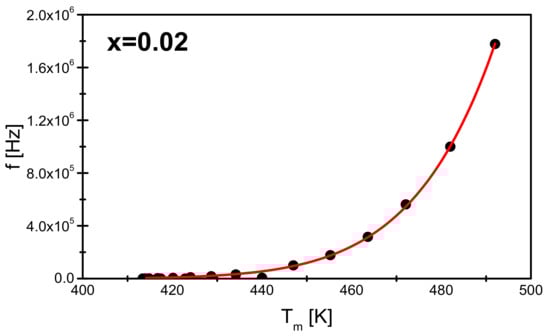 The dependence of Tm on the frequency of the measurement field obtained for the BBN ceramics doped with praseodymium for a mole fraction x = 0.02. The red line marks the fit to the Vogel—Fulcher equation.