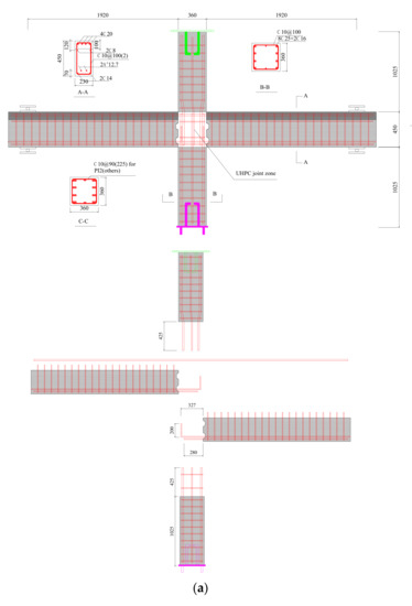 Ultra-high-performance concrete (UHPC) is an efficient material with the advantages of ultra-high strength and excellent bond strength [18]. With the use of UHPC in the joint zone, the connection details of precast beam-column joints can be simplified and improved [19,20]. The amounts of transverse reinforcements in the joint zone can be greatly reduced due to the high strength of UHPC. Moreover, the high bond strength between UHPC and rebars as well as strands can greatly shorten the anchorage length and lap-spliced length of reinforcement [21,22].