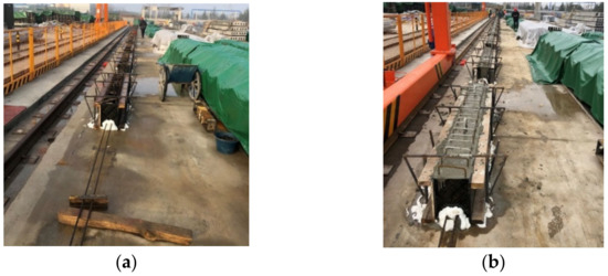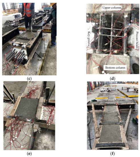 First, the wood formworks were conducted as the reinforcements of precast pretensioned prestressed beams were set, which can be seen in Figure 2a. In order to maintain UHPC and precast specimens integrated, the precast beam-UHPC interface should be designed with specialness. The 30 mm grooves were set as shear keys at the end of precast beams, as shown in Figure 2d. The strands were pretensioned before the concrete of the precast beam was poured and after 7 days, the strands were cut to release. When the concrete strength of precast beams and columns met the requirements, the joints were fabricated together, as seen in Figure 2d. Then, UHPC was poured in the joint zone without vibration due to its excellent fluidity, as can be seen in Figure 2e. The monolithic RC specimens and the precast beam-column connections were placed under same conditions for 28 days.