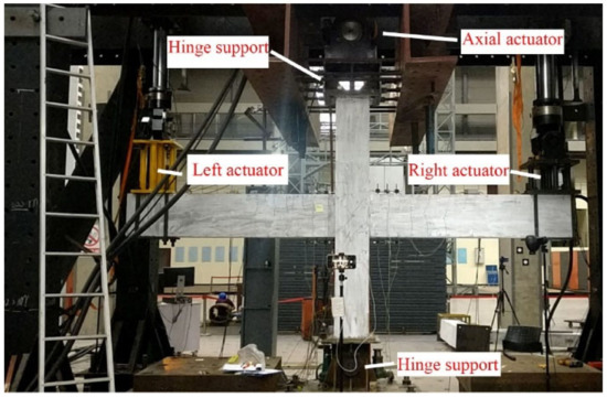 The test setup and boundary conditions of the beam-column joint specimens are shown in Figure 3. The base and top of the column were supported by a hinge and two hydraulic actuators were connected to the left and right beam. The positive direction was defined as when the actuators at the beam ends moved towards different directions so that the beam-column connection would clockwise rotate. The distance between the two actuators was 4200 mm. A constant axial force of 200 kN (600 kN for PI2 specimen) was applied to the columns by another actuator.