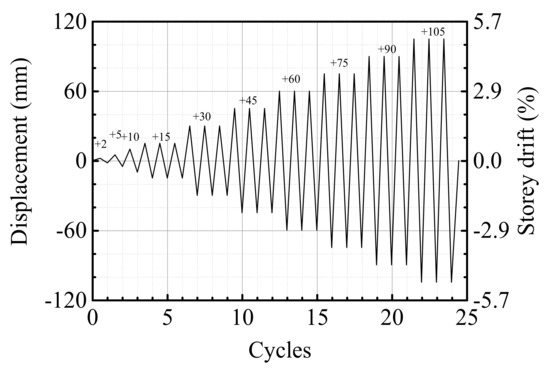 Figure 4 shows the loading protocol, which is specified by ACI 318-14 and adjusted based on the conditions of test lab and specimen size. Displacement control were applied in the whole test procedure. After applying the axial force, increasing displacements were applied one cycle at each level before the predicted yield displacement (). After that, each displacement was increased by and cycled for three times. The test stopped until the failure of specimens.