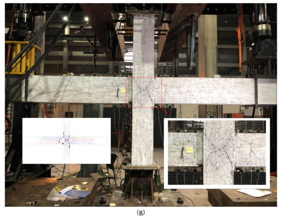 The hysteretic load–displacement curves of the specimen RI1 can be seen in Figure 6g. The failure mode of RI1 was the joint shear failure followed by beam longitudinal rebars yielding, which is shown in Figure 5g. The typical shear crack caused the joint shear failure after the displacement drift increased to 3.6%. Therefore, the hysteretic load–displacement curves started to pinch at the displacement of 75 mm because of the diagonal shear cracks. It should be mentioned that the reinforcement of the bottom beam for RI1 was 80% of that of the top beam. As a result, the peak load of the left beam in the positive direction and the right beam in the negative direction should be about 80% of that in the other direction. The test data showed about only 10% decrease in the peak load.