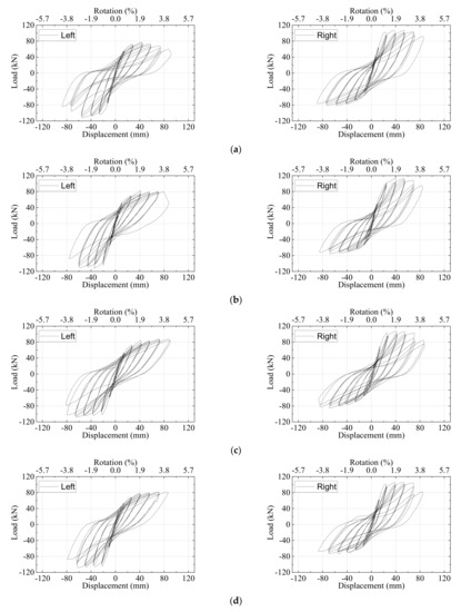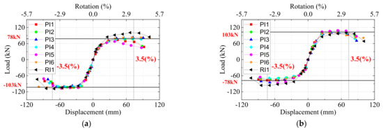 For the specimen PI1, the axial ratio was raised up from 0.03 to 0.1, the hysteretic curves showed comparable features to those of PI4, as shown in Figure 6a,b. The result indicated that a relatively lower axial ratio had little impact on seismic performance for the joints that suffered from beam flexural failure. However, as the displacement increased to −75 mm for the left beam, the curves became pinching due to the severe concrete spalling of left beam end which can be seen in Figure 5a.