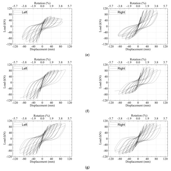 Hysteresis load–displacement curves. (a) Specimen PI1-L and PI1-R, (b) Specimen PI2-L and PI2-R, (c) Specimen PI3-L and PI3-R, (d) Specimen PI4-L and 4-R (e), Specimen PI5-L and PI5-R (f), Specimen PI6-L and PI6-R, (g) Specimen RI1-L and RI1-R.