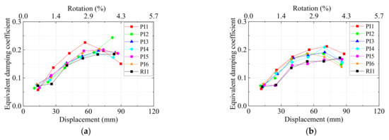 The relationship between the equivalent damping coefficient and the displacement for the seven specimens is shown in Figure 9. For right beams, except specimen PI5, the rest of the precast specimens exhibited higher values of than the monolithic RC specimen and the values kept increasing as the drifts were below 4%. After the yielding stage, the values range from 0.15 to 0.2 for the precast specimens. When the drift reached 4.3%, the decrease resulted from the fact that the cover concrete of precast beams spalled severely. In conclusion, the UHPC precast specimens show a better energy dissipation performance than RI1. In Zhang’s study [37], the values reached 0.2 when the drift reached 2%, which showed similar seismic performance to the authors’ specimens.