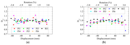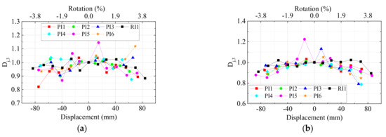 The strength degradation [45] was defined as when a structural component loses its bearing strength for repeated cycles at the same displacement. The strength degradation coefficient was introduced to evaluate the performance of strength degradation. Herein, and mean the ratio of the second and third cycle peak load to the first cycle at the same displacement, respectively. The curves of and versus displacement of all specimens are shown in Figure 10 and Figure 11.