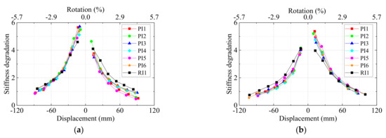 Stiffness degradation. (a) Left beams and (b) right beams.