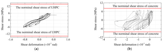 The shear stress versus shear deformation curves of specimen PI1 and RI1 are shown in Figure 14. The maximum shear deformation of the UHPC joint was less than 0.001 rad, which coincided with the results mentioned in the work by Zhang et al. [37]. Nevertheless, the shear deformation of RI1 reached its maximum value of 0.003 rad. The diagonal crack width in the joint area of UHPC specimens was 0.15 mm for maximum value only and for RI1, the value was 1.7 mm. The comparisons show that the damage caused by shear action for UHPC specimens was minor.
