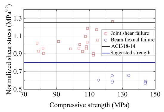 The maximum shear stresses of all specimens are summarized in Table 5. From the literature, Wang [36] carried out studies on the shear strength of seventeen monolithic UHPC beam column connections and the specimens were designed by the weak joint–strong specimen principle; therefore, shear failure could occur in the joint zone. Ma [38] studied the shear strength of three precast UHPC interior joints and shear failure happened. Zhang [37] studied the seismic performance of four precast UHPC interior joints and all specimens exhibited beam flexural failure. Based on the literature mentioned above and together with the six specimens in the authors’ test, the normalized shear stresses versus the compressive strength of UHPC scatter data were plotted in Figure 15. The normalized shear stress was defined as the shear stress divided by the square root of the compressive strength of UHPC, .