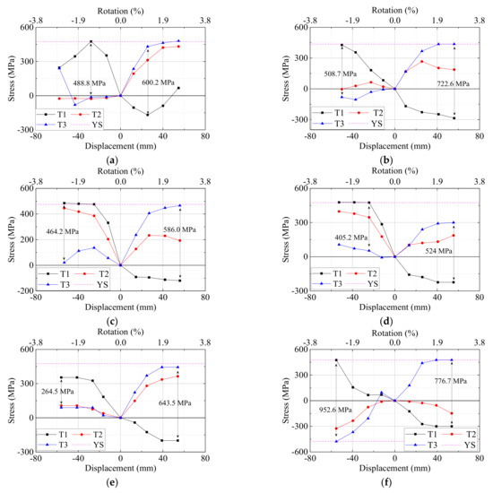 Stress versus displacement envelope curves. (a) Specimen PI1, (b) Specimen PI2, (c) Specimen PI3, (d) Specimen PI4, (e) Specimen PI5, (f) Specimen PI6.