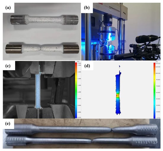 In the tensile test, the speckle was sprayed on the specimens, the coordinate information in the space of the speckle was recorded by two cameras when the load increased (Figure 2b), the strain cloud was calculated using the coordinate information, and the true stress-strain curves were finally obtained.