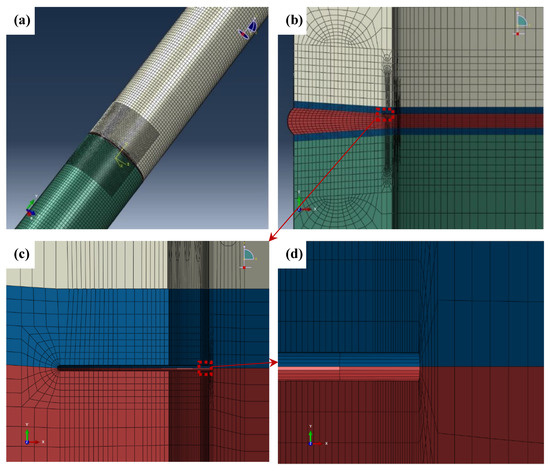Schematic diagram of FE model for the tube (crack depth is 4 mm). (a) The pipe model; (b) Mesh of the welding joint; (c) Mesh of the area near the crack tip; (d) Mesh of the area near the end of the notch.