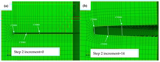 The CTOD values were obtained by measuring the distance between the two nodes (CTOD1, CTOD2 and CTOD3) near the crack tip. CTOD1 is the distance between the two nodes on the edge of the circular arc transition mesh, CTOD3 is the value a little further than CTOD1, and CTOD2 is the middle value, as shown in Figure 9a.