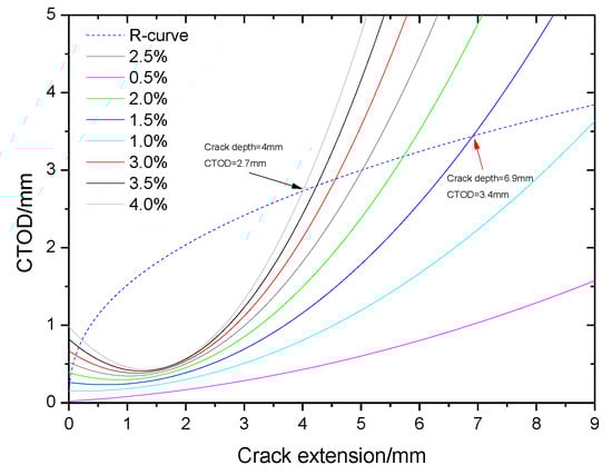 In Figure 11, the crack growth driving force curves with different tensile strain values are shown. When the crack depth of the pipe is less than 9 mm, the focus between the crack growth resistance curve and the crack driving force curves will not appear when the tensile strain is less than 0.01. This means that the crack growth resistance is higher than the driving force, and the crack will not propagate until the crack depth becomes larger. Moreover, there is a curve focus when the strain is 0.015. The crack depth is 6.9 mm and the CTOD value is 3.4 mm (pointed out with a red arrow in Figure 11) when the strain is 0.015, and the crack growth driving force is equal to the resistance. When the tensile strain is higher than 0.015, or the crack depth is larger than 6.9 mm, the crack growth driving force is always higher than the resistance, and the crack will run and not stop until it penetrates the whole wall. Then breakage of the weld of the pipe by crack propagation may finally occur.