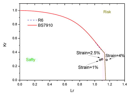 For comparison with the results of the FEA method, the failure assessments of the pipe with a crack were carried out using BS7910 and R6, as shown in Figure 12. The two failure assessment curves were close. The pipe was safe as the tensile strain observed was 0.01 and 0.025 according to BS7910 and R6, respectively. Moreover, the point is at the right side of the failure assessment curve as the tensile strain is 0.04; this implies that pipe breakage (weld failure) will occur, creating a significant risk.