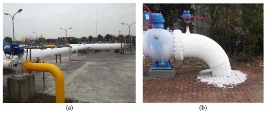 When natural gas is transported through a sub-transmission regulator, a pressure drop occurs due to throttling and expansion of the channel cross-section, resulting in a sharp drop in gas temperature in the pipeline [2]. This phenomenon is also known as the Joule–Thomson Effect, also known as the Throttling Effect. This is a common phenomenon in the operation of natural gas pipeline pressure regulation. According to certain studies [3], the temperature of the gas pipeline drops by approximately 4 °C to 5 °C for every 1 MPa reduction in pressure.