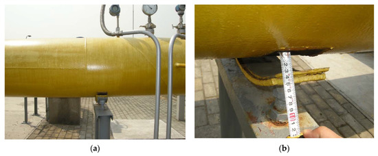 The large difference in pressure forces frost to form on the surface of the pipes even in the hot summer months as shown in Figure 2. However, it does not affect the normal operation of the high-pressure station, so it does not attract enough notice. With the arrival of winter, the air temperature rapidly decreases, leading to a serious deformation of the pipeline network in the regulator station, such as the high rise of the ground with buried pipelines, and cracks on the ground (shown in Figure 3). Meanwhile, the above-ground pipes are seriously raised, as shown in Figure 4, and some of the pipes were detached from their supports and suspended up to 30 mm.