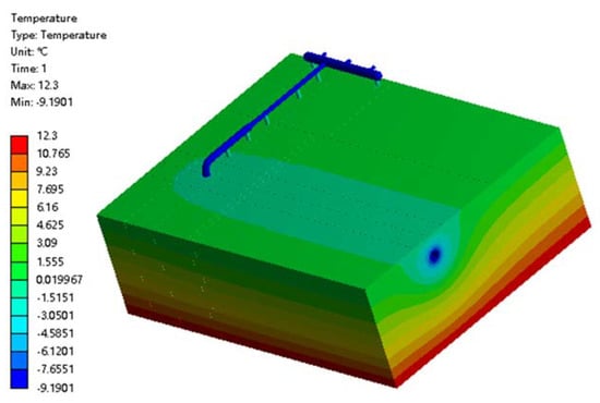 The temperature distribution of buried natural gas pipelines and the surrounding soil at high-pressure regulator stations is shown in Figure 6. It can be seen that the overall pipeline temperature is −9 °C, which is lower than the ambient temperature due to the good thermal conductivity of the pipeline and low pipeline temperature. Therefore, the frosting phenomenon on the surface of the pipeline is well explained. The soil has a constant temperature of 12.3 °C. The temperature of the soil at the bottom was constant, while the temperature of the soil away from the pipe decreased uniformly from the bottom to the top, but remained above 0 °C. However, the soil around the buried gas pipeline had a lower temperature of 0 °C, and the closer to the pipeline, the lower the temperature. In addition, the temperature of the soil was symmetrically distributed around the pipeline, but the temperature of the soil at the bottom of the pipeline was lower than the temperature at the top due to the constant higher temperature at the bottom of the soil and the lower air temperature, with natural convection heat exchange between the top and the air.