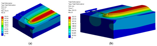 Overall frost heave damage diagram of buried pipeline and its surrounding soil: (a) cloud diagram of frost deformation of pipe–soil structures; (b) isometric cloud diagram of the frost deformation of the pipe–soil structure.