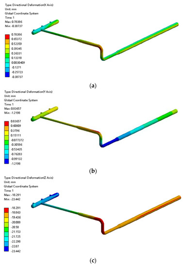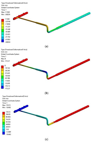 Cloud diagram of pipeline displacement at 0 °C: (a) cloud diagram of pipeline displacement at the x direction; (b) cloud diagram of pipeline displacement at the y direction; (c) cloud diagram of pipeline displacement at the z direction.