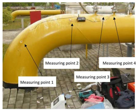 The strains of the pipeline in the above-ground bending section of the high-pressure regulator station were measured under frost and swelling conditions shown in Figure 9. In this case, the axial strains of the pipeline were measured at points 1, 2, and 4, and its radial strain was measured at point 3.