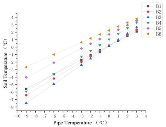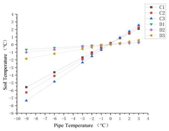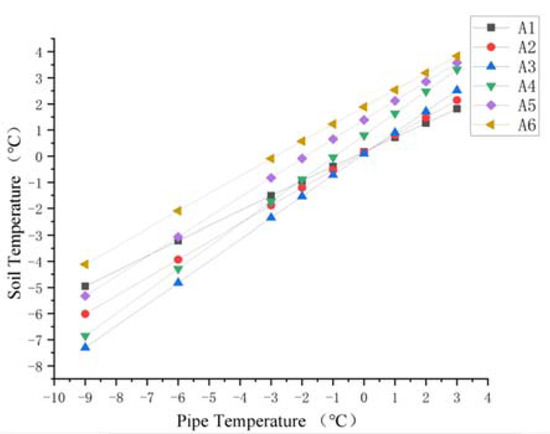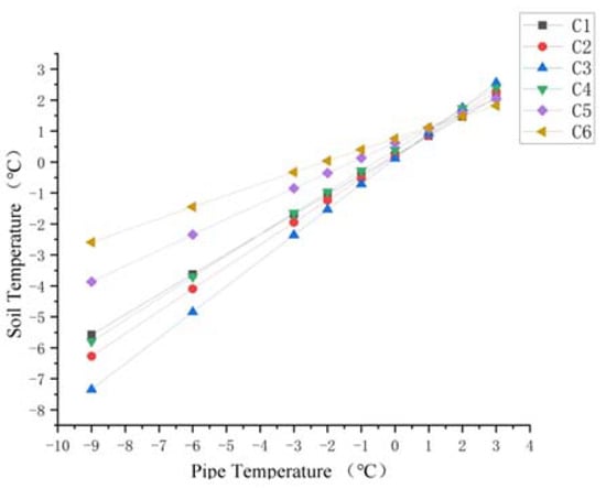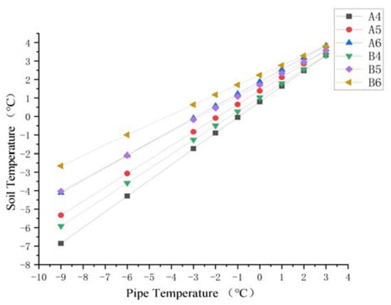 Hence, in order to prevent frost heaving of the soil around the inlet ascending section, it is sufficient to ensure that no frost heave of the soil on the right of the inlet ascending pipe occurs. In order to observe the influence of the pipe temperature on the soil temperature on the right-hand side of the inlet ascending pipe more clearly, the soil temperatures on the right side of the inlet ascending pipe can be compared at both sections. As shown in Figure 18, it can be seen that the change in soil temperature near the inlet ascending pipe is similar to that of soil temperature on the lower side of the buried ascending pipe. When the pipe temperature was −1 °C, although the soil temperature was below the freezing temperature, the temperature difference between the two adjacent nodes was small, all within 0.5 °C. At this time, soil frost heave occurred, but the amount of frost heave was small. Moreover, when the pipeline temperature reached 0 °C, the soil temperature was higher than the freezing temperature and no freezing and swelling occurred.