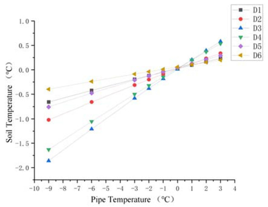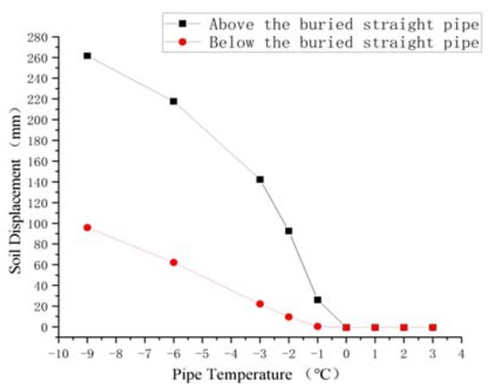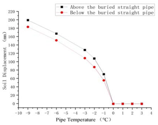 The soil displacement below the buried ascending reflects the height of the buried ascending pipe being lifted, while the soil displacement above it represents the observed ground soil uplift height. It can be seen that the height of buried ascending pipe and the height of ground uplift were gradually reduced with the increase of pipeline temperature. When the soil reached 0 °C, there was no frost heave. However, when the pipe temperature reached −1 °C, the change of soil displacement below the buried ascending pipe was about 0, that is, there was no obvious frost heave and the pipe is not lifted. At this time, the soil surface above the buried ascending pipe uplifted about 20 mm, which could be ignored when placed in a wide area of soil.