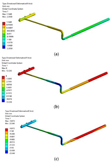Cloud diagram of pipeline displacement at −1 °C: (a) cloud diagram of pipeline displacement at the x direction; (b) cloud diagram of pipeline displacement at the y direction; (c) cloud diagram of pipeline displacement at the z direction.