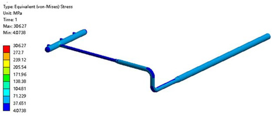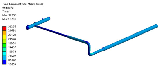 The pipe stress distribution at 0 °C is shown in Figure 24. Currently, there is no frost heave in the soil. The maximum overall stress in the pipe was 311MPa at the intersection of the manifold, which is similar to the stress distribution of the pipeline neglecting the frost heave.