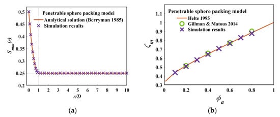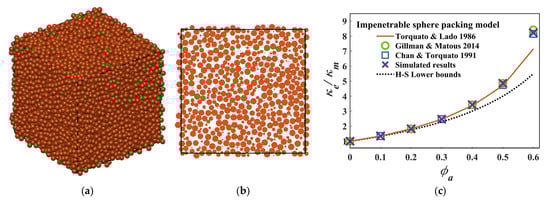 Figure 5a shows the comparison of the analytical and estimated 2-point correlation function of the matrix phase for the penetrable sphere packing. It is evident that the algorithm is able to calculate the 2-point correlation function with a high accuracy. In addition, the 2-point correlation function holds the relationships and , thereby satisfying the limiting value of . Figure 5b shows the results of the of the matrix phase for penetrable sphere packing and said results compared with other results in the literature [20,21]. This verified our algorithm in penetrable packing systems. As the packing of an impenetrable sphere model has been studied extensively [16,17,18,19,20], to better verify our algorithm, an impenetrable packing system of a monodisperse sphere was generated using a DEM-based method [28] to ensure the statistical isotropy; after a convergence study, the container side was set to be 20 times the length of the particle diameter (i.e., ), and the results of the impenetrable sphere packing system are shown in Figure 6a. Figure 6b is also shown to ensure that there is not any overlap between the particles. Impenetrable packing spheres with a packing fraction of were calculated using our approach, and the results were compared with existing ones, as shown in Figure 6c. An excellent agreement is shown between our results and the latest results by Gillman [20] and the simulation results by Chan and Torquato [15]. Therefore, the results of both penetrable and impenetrable packing systems verified our approach.