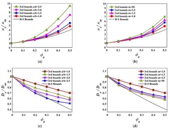 Third-order approximation of effective properties with strong contrast: (a) Normalized thermal conductivity with different aspect ratio; (b) Normalized thermal conductivity with different deformation coefficient; (c) Normalized diffusion coefficient with different aspect ratio; (d) Normalized diffusion coefficient with different deformation coefficient.