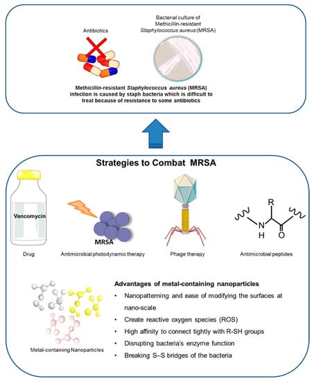 Emerging of metal-containing NP as an alternative strategy used to combat MRSA. Figure was modified using Servier Medical Art templates, which are licensed under a Creative Commons Attribution 3.0 Unported License (https://creativecommons.org/licenses/by/3.0/) [Accessed on 10 June 2022].