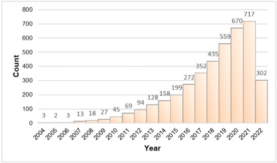 The increasing trend of research into nanomaterials and antibacterial resistance, as reflected by increasing publications in PubMed (updated: 7 June 2022).