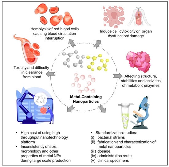 At present, there are only a few clinical trials working on the effect of metal-containing NPs on nosocomial bacteria, such as the Staphylococcus aureus and Pseudomonas aeruginosa. This could be due to the high cost of using the high-throughput nanotechnology platform and equipment other than the scaled-up manufacturing of these nanomaterials [102]. Furthermore, inconsistency of size, morphology, and other properties of these metal-containing NPs for the large-scale production may contribute to the difficulties in producing efficient and potent NPs are also a major challenge [102,113].