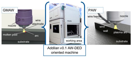 The samples were manufactured on the ADDILAN V0.1 machine (see Figure 1), which has a working volume of 1300 mm × 900 mm × 500 mm for weights up to three hundred kilograms. It has a dedicated numerical control that allows access to variables and process parameters. Among the processes and technologies to be integrated into the machine, WAAM is available, mainly Plasma Arc Welding (PAW), Gas Tungsten Arc Welding (GTAW) or Gas Metal Arc Welding (GMAW), with interchangeable torches, depending on the material and metallic properties desired. These torches are integrated into a 4-axis head. In addition, it has an inert chamber in which there is a tilting table with Cartesian coordinates.
