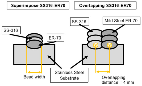 In the previous section, we discussed how the properties of each material were tested separately and proved to be optimum. In this section, we discuss the challenge it was to combine both PAW and GMAW technologies to successfully fabricate a bimetallic wall. The walls were manufactured by using two methods (Figure 6): (1) straight wall overlapping beads one upon the other, alternating one bead of each material; and (2) overlapping beads with a separation of 4 mm.