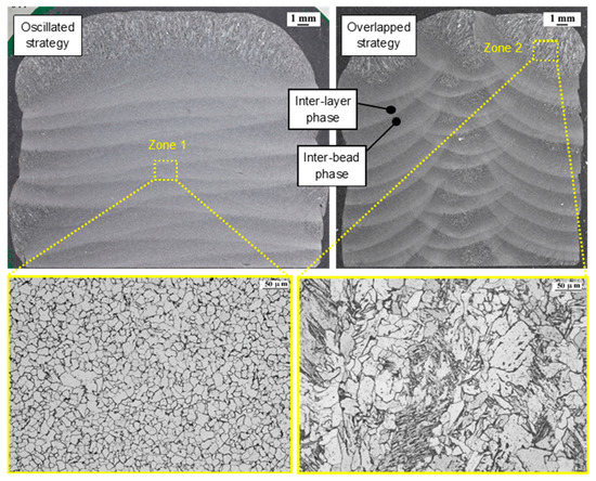 Figure 4 shows the typical anisotropy of wire arc additive manufacturing in the arrangement on the inner surface of the wall since the process is produced by the layer-by-layer addition of material. There are clear differences in the layer-by-layer arrangement for each of the strategies (oscillating and overlapping). In the case of oscillation, the presence of a single interface per layer is observed since each layer is formed by a single continuous path. In the case of the overlapping wall, three beads are formed that make up each layer, due to the three paths per individual layer. These interfaces between the weld beads that make up each layer cause there to be less continuity within the wall. As Aldalur et al. [17] demonstrated, the microstructure observed in Zone 1 of Figure 4 is polygonal ferrite since these areas were subjected to thermal cycles. In Zone 2, acicular ferrite appears, as these layers do not experience the thermal effect of the following layer. With the overlapped strategy, a more heterogeneous microstructure is obtained, where polygonal ferrite and acicular ferrite microstructure are intercalated.