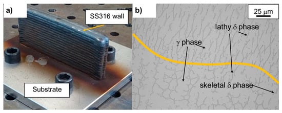Two identical double walls were fabricated by using the parameters mentioned in Table 4 for PAW technology. The first wall was used to analyze the microstructure of the material in PAW. In this section, the microstructure of a 316L-Si stainless steel alloy fabricated by Plasma Arc Welding (PAW) technology is studied. Figure 5b shows the microstructure of the wall in the union between two weld beads. In the interfacial zone, the concentration of δ-ferrite phases is higher, due to temperature gradients caused by thermal effects. The typical phase structure of ferrite within an austenite matrix is observed. If we focus on the δ-ferrite phase, it is arranged in the form of a skeletal δ phase in the lower part, and a more lathy-like formation in the interface zone. In addition to these structural metallographic characteristics of the SS 316L-Si material manufactured by PAW, no faults such as lack of melting, pores or cracks were observed in any of the processes.
