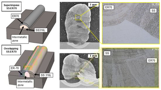 In both cases, the junction between the two materials, the intermetallic zone, must be analyzed because there is a risk of cracks, pores and underfilling. Figure 6 shows the macroscopic images of both walls. Visually, no cracks or other defects are visible. The intermetallic structure is continuous in both cases. The right side of the image shows the microstructure of the junction, where both parts are visible. As corresponds to each material, ER70S-6 shows a microstructure formed by a bainitic structure, while SS 316L shows δ-ferrite within an austenitic matrix.
