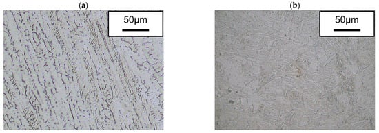 Therefore, the intermetallic structure obtained in the fabrication by using WAAM technology to obtain a bimetallic structure of mild steel and stainless steel is continuous and does not show any defects. This demonstrates the potential of this technology to manufacture perfectly functional bimetallic structures without any problems in the junction. Figure 7 shows the microstructures at a higher magnification, where the absence of microcracks is observed. Moreover, Figure 7b shows the formation of molybdenum carbides in the case of ER70.