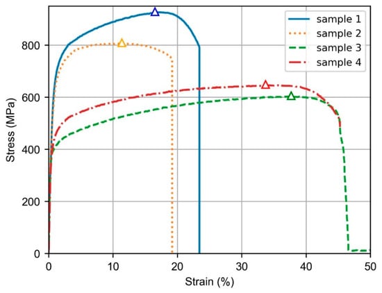 Results of the stress–strain curve for the specimens extracted from the manufactured walls, the triangles show the UTS for each test.
