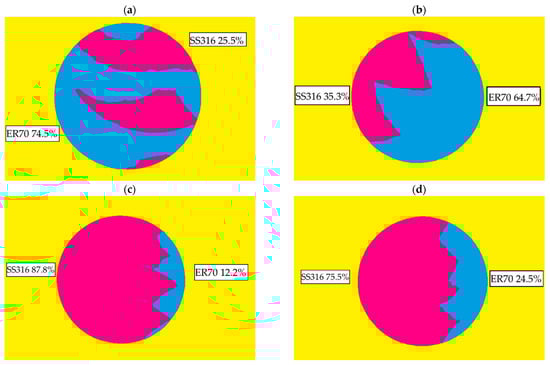Taking the structure revealed in Figure 10 and applying a mask, the percentage of each material in the extracted samples can be estimated, as can be seen in Figure 10. The different materials were determined from the macrographs of specimens taken with the Nikon Eclipse MA200 microscope (Tokyo, Japan) and analyzed with Nikon NIS-Elements Imaging Software. The ER70 mild-steel material is colored in blue, while the SS 316L stainless steel is colored in magenta; the color version of Figure 10 can be seen only on the Web version of the paper. It is observed that Sample 1 is the one with the highest percentage of ER70, as seen in Figure 10a. In Samples 3 and 4, on the other hand, the presence of stainless steel is much greater. The nature of the structure and disposition of the metals that form the structure of the specimen in percentage show a high correlation with the mechanical results shown in Figure 7.