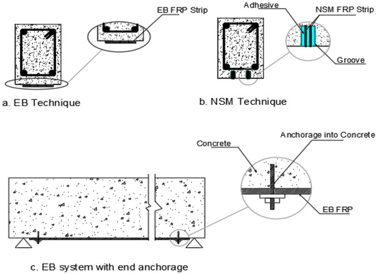 Fibres have been engineered over the years to form exterior bonded and near-surface mounted natural fibre composites in reinforced concrete beams, as seen in Figure 2, Figure 3 and Figure 4 for various strengthening systems. These strengthening systems include flexural strengthening, shear strengthening, torsional strengthening, and hybrid strengthening, which provide strengthening for combined structural behaviours. Studies have shown externally bonded FRPs can be applied to the soffits of RC beams using a plane FRP fabrics which are bonded in layers by the aid of an adhesive [17,18]. These are usually adopted to raise the flexural capacity of the structural beams. Also, these fabrics can be utilized to envelop the beam in the form of a U-shape, engulfing the soffit and 2 sides of the beams with the same anchoring system through the use of an adhesive. This method is most often adopted to improve the shear and torsional strength of RC beams [19,20]. It can be applied to tunneling, bridge decks, slabs, dock loading, thin unbonded overlays, concrete plinths and platforms, and concrete sheets [21]. Designing externally bonded FRP has been made easier thanks to the work of several international organizations. This guidance relies on a defined pull-out strain between FRP and reinforced concrete when utilized for bond-critical applications to examine the raise in member structural strength (e.g., ACI 440.2R-17) [22]. However, as per the studies, de-bonding occurs at low FRP strain from the concrete surface, despite the EB FRP technique’s widespread popularity. Hence, the full potential of FRP cannot be developed with this approach [23,24]. Reinforced Concrete structures such as slabs or beams may fail in a variety of ways, including concrete crushing, yielding the steel, rupturing the FRP, and failing to join at the concrete-FRP interface [25]. These can occur when concrete is subjected to a wide variety of environmental variables depending on the structure type, locale, and other variables. Thermal conditions, moisture, chemical assaults, UV radiation, salt, deicing agents, freezing and thawing cycles, and alkaline water intrusion all fall within this category [22]. Due to the noted drawback of the EB FRP system (delamination failure), NSM FRP technology has been used. As illustrated in Figure 2, the NSM FRP system begins with grooves etched into the surface of concrete and then attaches the FRP composites to these grooves with a suitable bonding material [24,26]. It was invented between 1940 and 1949 in Europe by inserting steel rods through slits cut into the surface of concrete structures using cement mortar as the idea of the NSM FRP technique [24,27]. When comparing the two FRP systems, the NSM FRP system exhibits a greater bond advantage. The NSM technique can further offer protection to the FRP composite against damage and the impacts of environmental agencies [24,28].