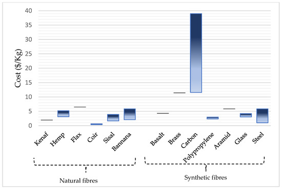 An increasing number of people throughout the globe are turning to synthetic fibres such as glass, carbon, or aramid for reinforcement and retrofitting purposes. From considerable research carried out throughout the globe over the past 30 years, we have gained a greater knowledge of the characteristics and behavior of FRPs under various situations [33]. Thus, more FRPs will likely be used in the future. However, the use of synthetic fibres in rural regions is unlikely due to their relatively high cost and limited use. New revolutionary materials technologies in civil engineering have begun to find their way into the market to suit the needs of advanced infrastructure. Innovators in the fields of textiles, transportation, aviation, and construction may all benefit from advancements in science and technology because of the universal properties that make them applicable across several sectors [34]. Recent years have seen renewed interest in using natural FRP composites in place of conventional FRP materials such as glass fibre and carbon fibre because of the potential benefits of good strength-to-weight ratio, lower material prices, and natural fibres being sustainable materials, as portrayed in several studies. However, the current cost of natural fibres, as shown in Figure 5, almost measures up with some synthetic fibres because of their increasing demand and applicability in various sectors such as building, gardening, pulp and paper, cosmetic, food and automotive sectors, among others. Despite these recent findings, these fibres possess good mechanical and strength properties and they are eco-friendly and require low energy inputs, as shown in Table 1 and Figure 6.