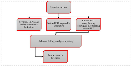 Figure 8 shows the flow chart of paper organization, which defines the review process. It is divided into six main sections, which include (i) The literature review (ii) Synthetic fibre reinforcement usage and environmental implications; (iii) Natural FRP as possible alternative to synthetic FRPs; (iv) EB and NSM strengthening techniques incorporating natural FRPs; (v) Key findings and gap spotting, and (vi) Future research directions.