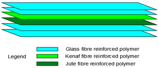 For enhanced strengthening, some researchers propose merging synthetic fibres with natural fibres to better the mechanical and structural strength of RC constructions because of the downsides (such as increased water absorption and lower mechanical strength qualities when compared to glass fibres) of employing natural fibres [46]. This is termed hybridization. A study by Chethan et al. [46] looked at the effects of different laminate stacking orders of E-glass/kenaf/jute fabric epoxy resin plates on the tensile and flexural behaviour of RC beams as shown in Figure 10. Increasing the amount of glass plies significantly improved the mechanical characteristics of kenaf and glass fibre hybrid laminates, compared to jute and glass fibre hybrid laminates up to 244 MPa in flexure.