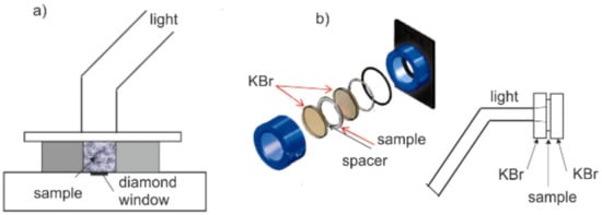In the transmission mode, the samples were placed centrally on the KBr crystal (diameter 25 mm, thickness 3 mm). A 0.2 mm spacer was placed over the periphery of the crystal, and a second KBr crystal was applied. They were slowly compressed to the configuration of the washer thickness and placed in the holder. The schematic arrangement of the sample is presented below in Figure 1.