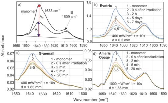 The reference point in the DC calculation is the monomer absorbance peak, so a systematic error is made over the entire DC range. The measurement and reference bands are not separated. The condition for such separation is the location of point B (Figure 2a) on the baseline. This is a classic case in spectroscopic research. The value of the actual absorbance of the reference band can be determined by the deconvolution method. There are also cases of resins where the absorption band at 1608 cm−1 is barely visible (Figure 2c), and, in these cases, the method based on relative measurements would not be possible in point measurements.