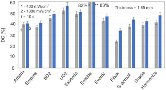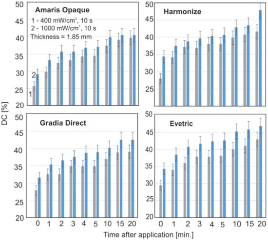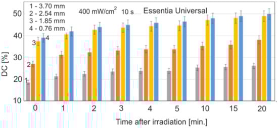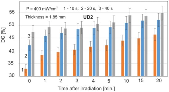 From the point of view of dental applications, the important parameter is the exposure time. Figure 5 shows the value of DC after irradiation at 10, 20, and 40 s.