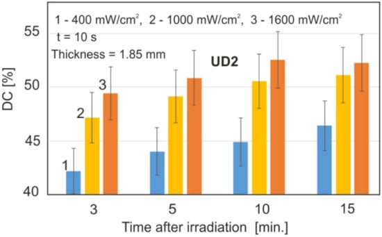 The power density activating the photopolymerization of the radiation is of fundamental importance for the DC values. It is especially visible in the initial stages of monomer conversion; with time, these differences become smaller and smaller. However, the increase in power density from 1000 to 1600 mW/cm2 does not cause a significant increase in DC (Figure 4).